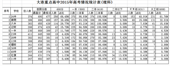 这个统计表是根据“高考信息通”的高考去向明细数据统计的,原始数据由小二老师提供。这个统计算是他交给我的任务吧,我统计完了将结果发回给小二老师,本来是想作为内部资料参考的,但看到好些家长因为孩子跌入普高闷闷不乐,俺觉得还是应该发布一下,让大家知道大连各高中高考的真实情况。