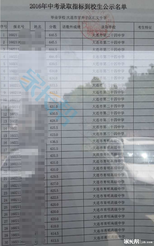 大连汇文中学2016年中考指标公示材料