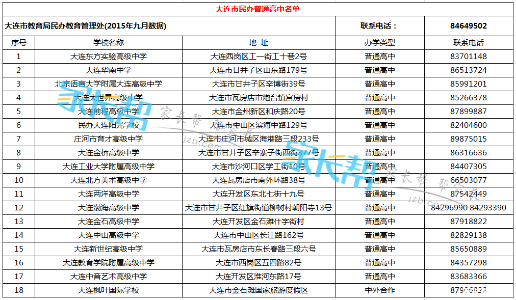 大连市民办普通高中名录(地址、电话)