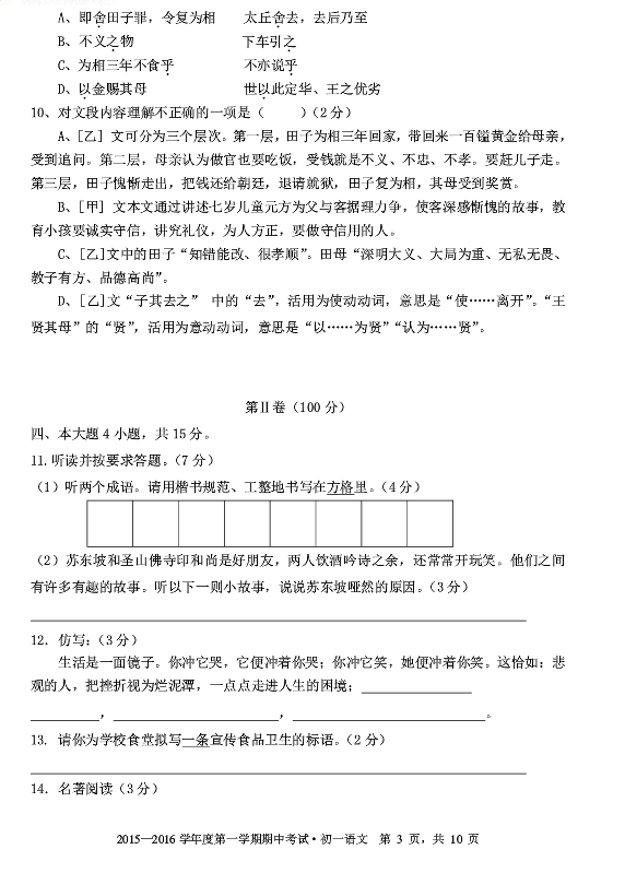 大连普兰店2015-2016学年初一上期中语文试题(3)