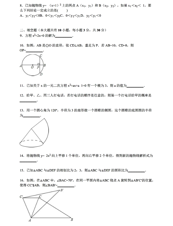 大连高新区2015-2016学年初三上期末数学试卷(2)