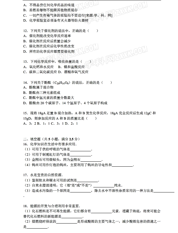 大连西岗区2014-2015学年初三上期末化学试卷(2)