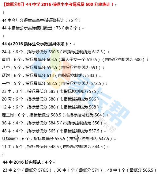 大连44中学2016指标生录取情况及三甲、600分率统计