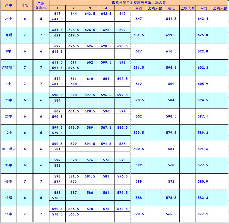 2016年大连市内五区指标到校录取数据