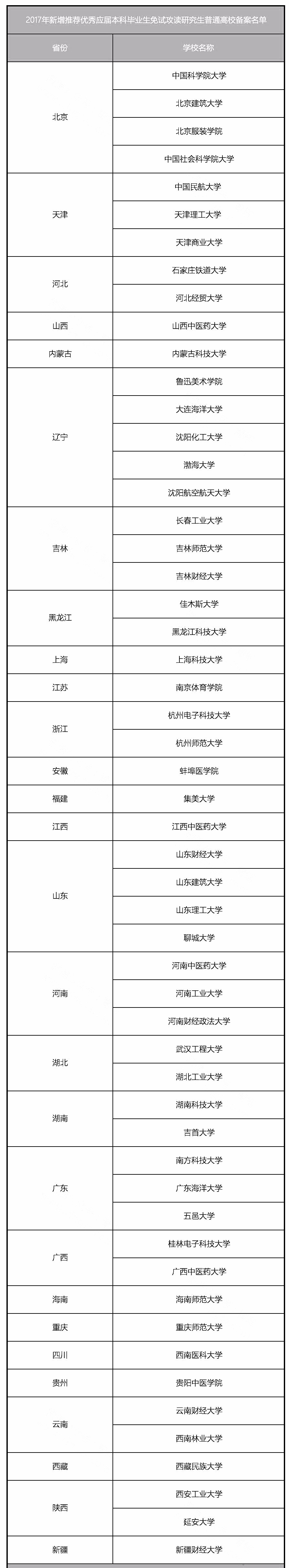 值得关注的是,与各省公示的名单相比,有多所高校没能通过教育部的最终评审,落选2017年新增研究生推免高校。获得教育部备案的54所高校名单如下: